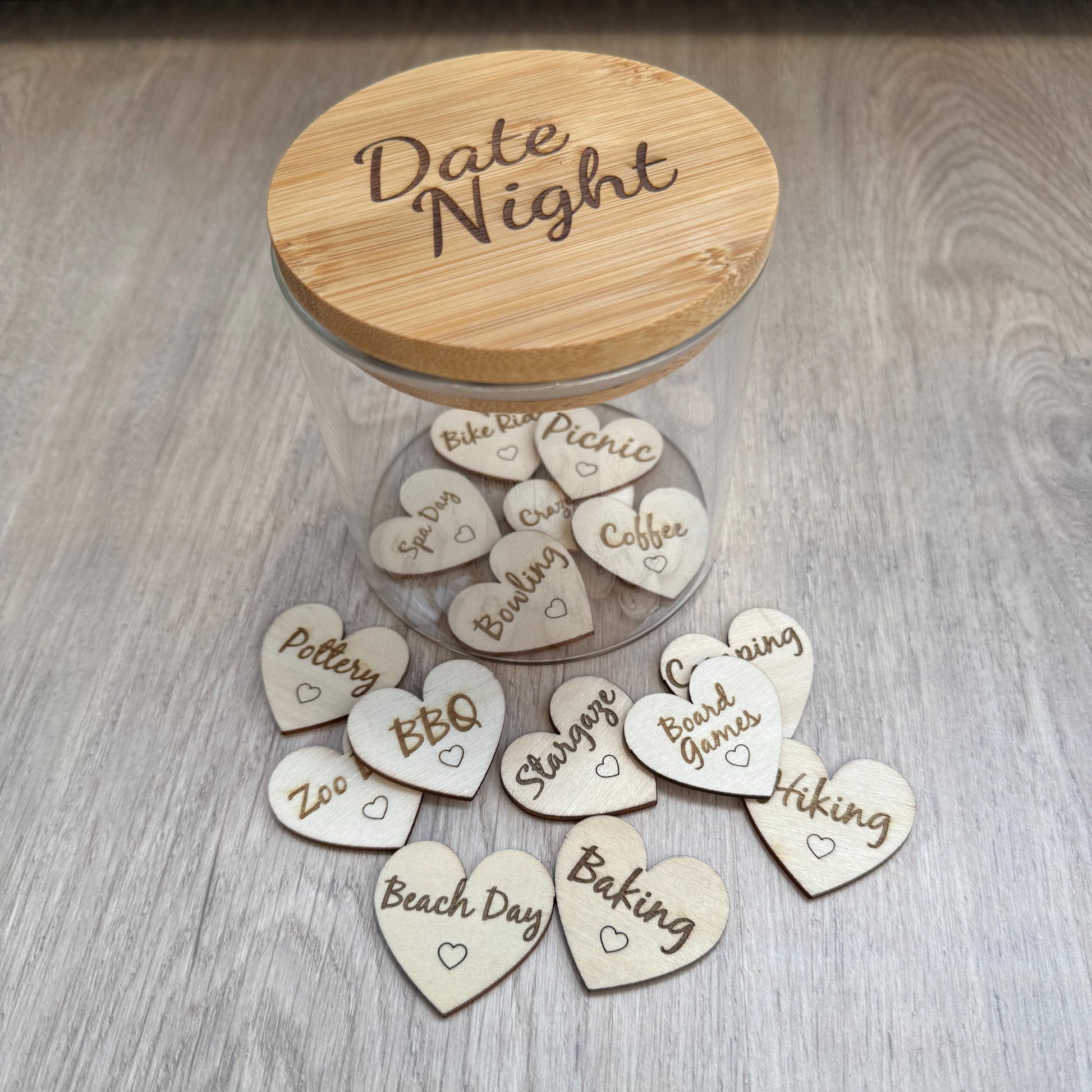 Make date night extra special with this charming glass jar featuring a laser engraved bamboo lid. Inside you will find 15 individual wooden hearts, each with a unique and fun date idea to inspire quality time together. Perfect for couples, anniversaries, weddings, Valentine's Day, or just because, this gift is a thoughtful way to keep the spark alive. Whether you're newly together or have been in love for years, this jar turns "what should we do tonight?" into a moment of excitement and surprise.