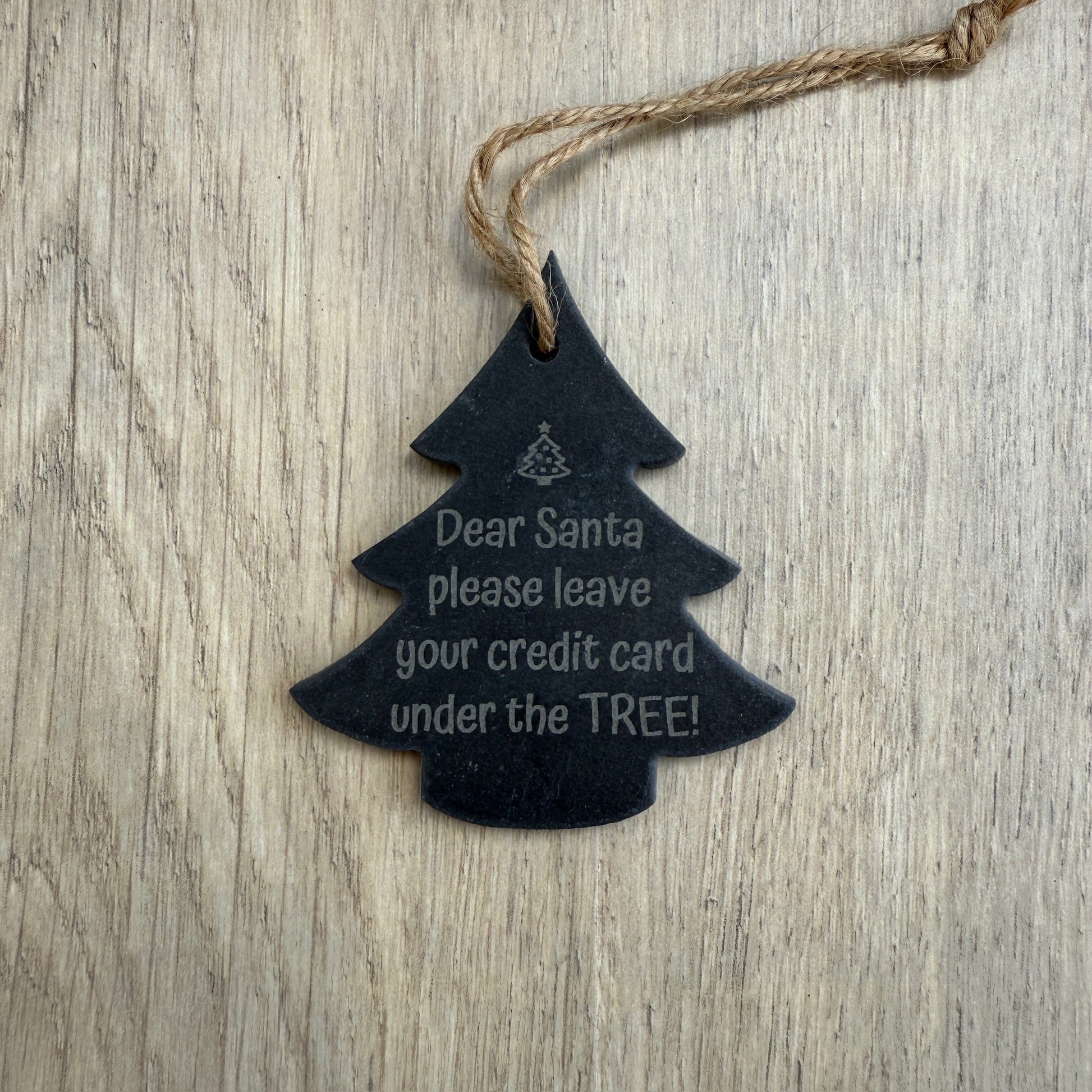 Add a touch of festive charm to your home with this laser-engraved slate hanger, featuring the words “Dear Santa please leave your credit card under the tree!”