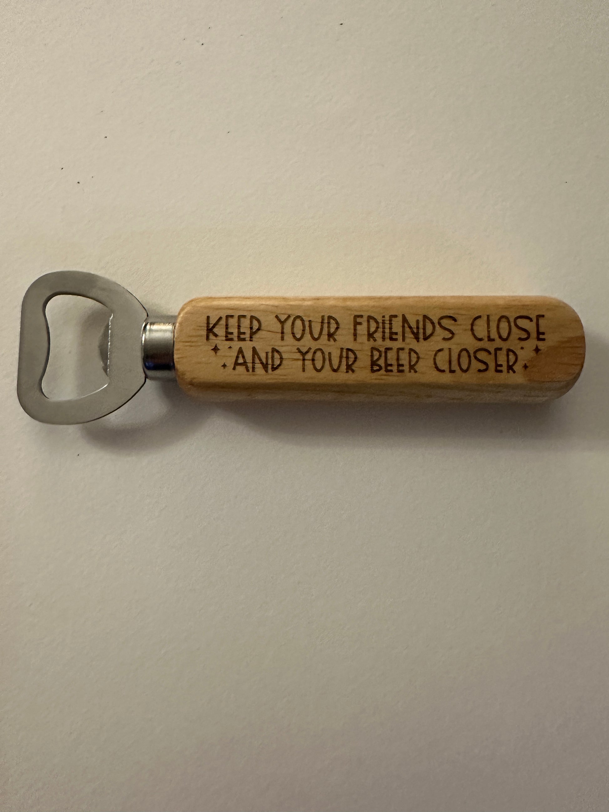 Bring some humour to your next drink with this engraved wooden handle bottle opener, featuring the witty phrase “Keep Your Friends Close and Your Beer Closer.” A perfect mix of style and laughter – ideal for any beer lover’s collection!
