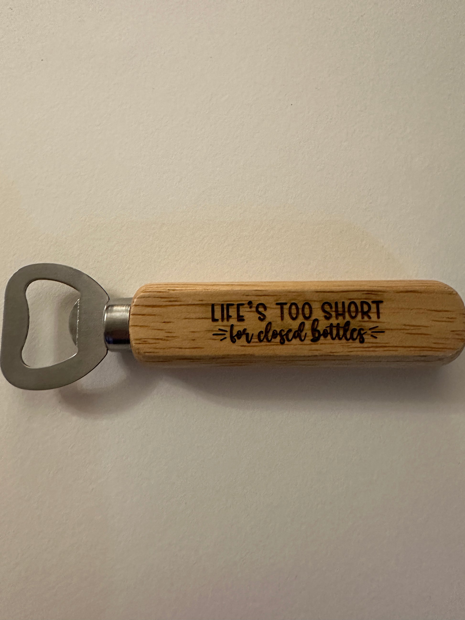 Make every drink an occasion with this engraved wooden handle bottle opener, featuring the witty phrase “Life’s Too Short for Closed Bottles.” Perfect for anyone who loves a good laugh and an even better beer!